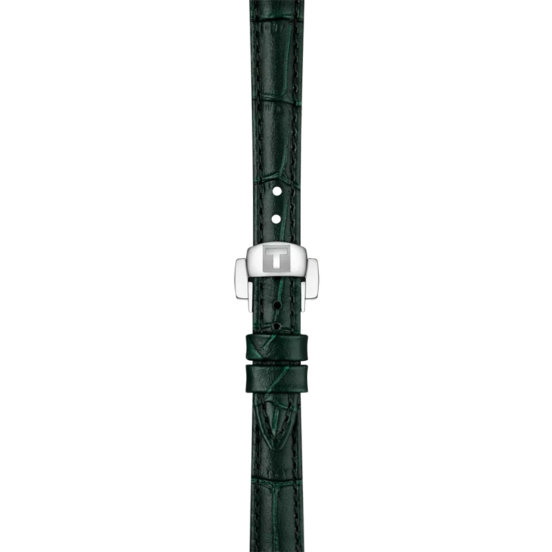 Den gröna remmen i präglat läder ger en mjuk kontrast till stålet och gör modellen extra mångsidig. Klockan är vattentät upp till 5 bar, vilket gör den tålig nog för vardagens rörelse men samtidigt tillräckligt elegant för festligare tillfällen. Tissot Bellissima visar hur en modern damklocka kan förena tradition, design och praktisk användbarhet i ett harmoniskt och attraktivt armbandsur.