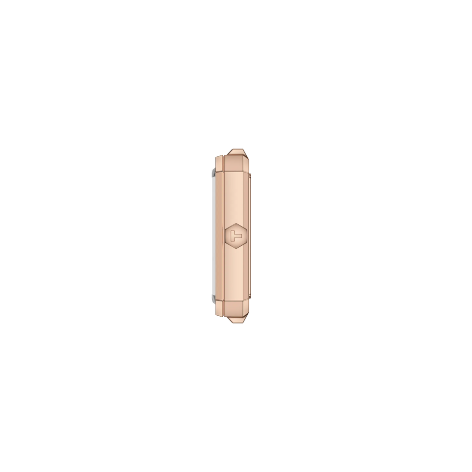 Den rektangulära boetten i 316L rostfritt stål med carnation gold PVD‑beläggning ger klockan en varm, feminin glans. Det reptåliga safirglaset skyddar klockan och bevarar dess skönhet år efter år.